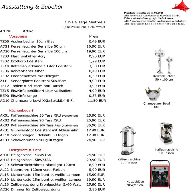 Berechnung der Lieferkosten für Anlieferung und Rückholung (inkl. gesetzl. MwSt.), mit ebenerdiger Anlieferung. Zusammentragen der Gegenstände bei Abholung nicht inbegriffen. Persönliche Abholung aller Artikel (außer Zelte) ist möglich.